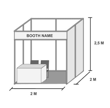 1 space terdiri dari 1 booth partisi R8 dengan ukuran 2m × 2m