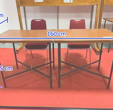 1 space terdiri dari 2 Meja 80 cm x 60 cm (total 160 cm x 60 cm)